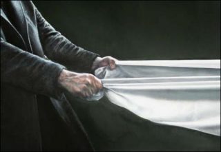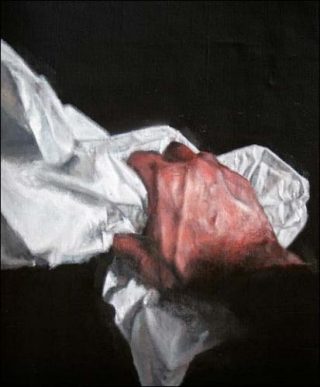 Composée par touches et frottements, la chair contraste avec les autres matières aux inerties différentes, lisses, inertes, lourdes — steak sur du bleu. La chair est effervescente. Chimie à vif et en suspens. Le visage expose ses tissus; ils sont perçus dans leur fragilité fondamentale, voués à l’inéluctable décomposition, chair putréfiable, violacée mais ici conservée dans l’air raréfié, tendue inexorablement, les yeux secs ouverts sur l’effort. Pas froid aux yeux.