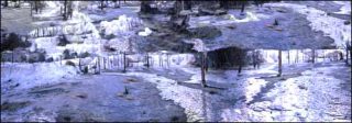 Le même paysage vallonné se retrouve sur les deux écrans, avec quelques arbres, parfois sans végétation. Le noir et blanc renforce la sobriété du motif. Par moments de gros plans sur le sol composent des tableaux inédits. Pas de bande sonore, mais parfois des superpositions de clichés du même paysage animent légèrement une vidéo très peu mobile.