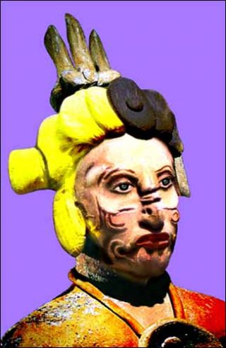 — Heaume de Tanzanie et visage de femme stéphano-européenne, 2003. Photo numérique, tirage papier photographique couleur. 125 cm x 156 cm.