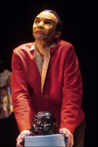 Dans Trickster donc, les tours sont nombreux et les paroles se font rares. Ce sont plutôt onomatopées, improvisations sonores, bégaiements, qui ont pour tâche de décoller la parole du sens pour arriver à de purs enjeux mélodiques. Trickster prend donc le théâtre à son point de départ : desgestes, des sons et des masques.