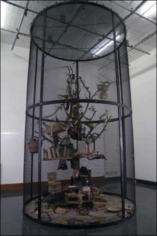 — Library for the birds of massachusetts, 2005. Acier, arbre, contre-plaqué, livres, oiseaux, matériaux divers. 400 x 240 cm
