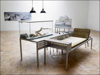 — In bed with a Cold Blooded Animal, 2008. Structure en acier perforé, vitrine, lampes, branche, coussin, lézard. 114 x 236 x 140 cm