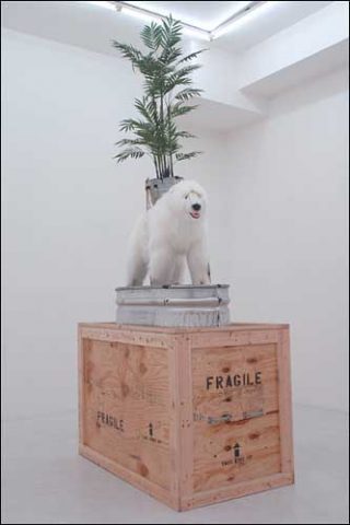 — Iceberg and Palm Trees, 2007. Ours en peluche, boite en aluminium, plante en tissu dans un seau en aluminium, goudron, tendeurs, caisse de transport. 330 x 100 x 150 cm
