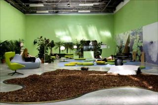 L’installation de Sergio Vega, Crocodilian Fantasies, invite à s’immerger dans un salon tropical. La sophistication du design s’alimente à l’effet apaisant d’une présence naturelle: un tapis en forme d’étang est recouvert de coussins-nénuphars. Les plantes qui ornent ce salon servent d’ornement, et d’immenses photographies de nénuphars sur les murs complètent ces artifices de la décoration végétale.