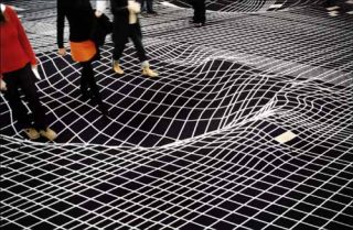 Le sol de l’exposition est recouvert d’un quadrillage plastifié, dont les effets de perspective donnent une impression de relief. Déstabilisé par cette illusion, le pas perd son assurance, impuissant à s’approprier un espace qui le fait vaciller.