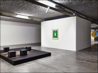 Au milieu, l’installation Quad, du nom des «Pièces pour la télévision» de Beckett garde les traces d’une performance réalisée en amont de l’exposition. Elle se présente comme une estrade noire sur laquelle sont posés quatre socles, de la même couleur. Des empreintes dessinées au sable signalent des cubes absents, en référence à la chorégraphie muette pour quatre danseurs exécutée autour d’un carré invisible dans l’œuvre de Beckett. Francisco Tropa rappelle la sculpture au sable qui en constitue une des matières premières et originelles, plaçant symboliquement la performance dans une arène (arena: sable en latin), métaphore d’un spectacle public qui est aussi un combat. La fouille archéologique prend d’emblée la forme d’une enquête autoréférentielle, d’un art qui s’interroge sur sa condition, son origine et sa vocation.