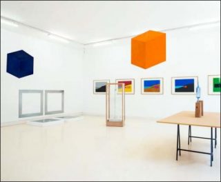 La seconde salle réunit deux œuvres. La première, inspirée du texte de Cicéron Le Rêve de Scipion, consiste en deux demi-sphères et un cube d’acier suspendus au centre de l’espace. De couleurs jaune, rouge et bleu, les sculptures font clairement penser à un mobile de Calder, en même temps qu’elles reconstituent un système solaire erroné, ancré dans une représentation archaïque du monde. La vision de la terre plate —qui a valu des mésopotamiens jusqu’au Moyen-âge— inspire ici la forme d’une planète cubique, organisant le glissement du registre de la cosmogonie antique à celui du formalisme de l’art moderne. Les effets d’optique provoqués par la bichromie d’une sphère (une face rouge, l’autre jaune) ou la fausse perspective du cube (en réalité dessiné à plat) installent un jeu perceptif qui finit par dominer le discours sur leurs possibles significations.