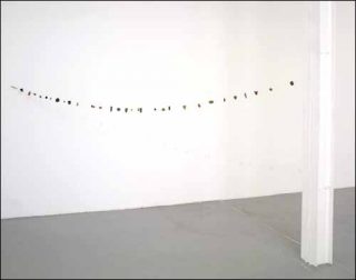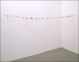 On entre dans la salle comme dans un musée d’anthropologie. Ce qui s’y raconte est d’un autre temps, d’une autre époque. Une guirlande d’objets en terre cuite attire l’œil. De quoi s’agit-il ? Vestiges d’une civilisation inconnue, ils témoignent de l’existence d’un peuple ancien. Les Koropokkurus, pygmées apparus dans une légende lointaine avaient pour habitude de suspendre leurs poteries. Allusion, reconstitution : l’artiste se substitue à l’archéologue. Toutes les pièces sont intactes. Le temps n’a laissé aucune trace de son passage. La fiction mise en place est troublante. Que cherche-t-on à nous faire croire ? Les photographies des fouilles réalisées dans le jardin d’Ozawa apportent de la crédibilité à l’ensemble. Les tranchées et les jalons métalliques fixent les repères spatio-temporels qui faisaient défaut jusqu’alors. Les sujets miniatures sont alignés dans les sillons de terre, tombés à l’aplomb de leur apesanteur préméditée. Si au premier abord notre œil est sans méfiance, à bien y regarder on soupçonne l’artifice. La mise en scène devient alors moins réaliste. Les trouées qui criblent le sol ont des formes géométriques injustifiées. L’alignement parfait n’est plus qu’un dessin improbable et l’endroit, le théâtre d’une imposture. L’artiste brouille les pistes. Une série de toiles semble nous livrer le début d’une explication. Impressions passagères. Narration énigmatique. Un petit être sort d’une tente en branchage et tient dans ses bras un poisson gigantesque. Pas de paysage. Où sommes-nous ? Le ciel arbore les empreintes des objets suspendus. Cette frise se poursuit d’un tableau à l’autre et le hors-champ utilisé guide notre regard. Déplacement panoramique. On pivote sur nous-mêmes pour retrouver dans le coin droit une autre suspension. Passage, va-et-vient entre chaque image : Ozawa alterne les mouvements. Le cube peint sur le mur à l’entrée de la salle en devient le symbole. Le jeu d’optique fait écho à l’illusion de réalité mise en espace autour de nous. L’alternance entre la profondeur et la surface éveille l’indécision du regard et souligne un questionnement. Quelle certitude peut-on avoir face à une image ?