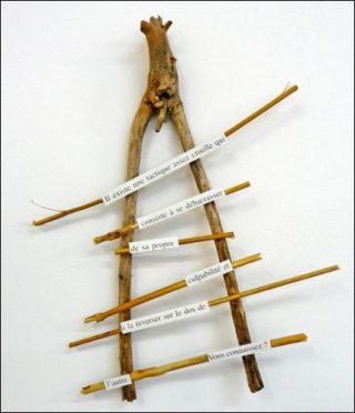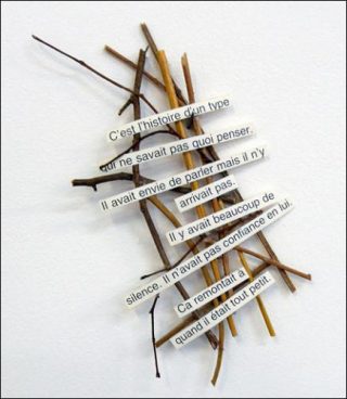D’autres Å“uvres sont composées à partir d’assemblages de très fines brindilles en bois fixés au mur. Il s’agit de courts poèmes dactylographiés sur des bandelettes de papier découpées et collées sur les brindilles. Ces textes en prose trouvent une forme d’organisation dans la structure de papier et de bois. En effet, la disposition et le découpage des bandelettes en rythment la lecture. Les textes, plutôt minimalistes, se situent entre la poésie et la maxime, et acquièrent, grâce aux brindilles, une profondeur visuelle.