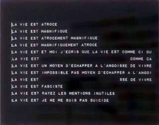— Pierre Tilman, La vie est, 1980. Texte dymo sur plexi noir