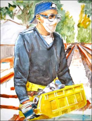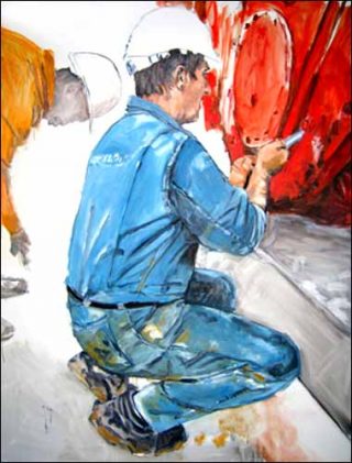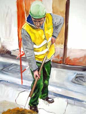 L’artiste dépeint son environnement à la manière d’un narrateur des temps modernes. Outre le style actuel et vif, tranché dans des couleurs vives sur un fond laissé volontairement vierge, il y a une volonté de respecter la tradition picturale: référence faite aux néo-réalistes, brillamment illustré chez Caillebotte en 1875, qui déjà peignait Les Raboteurs de parquets sur leur lieu de travail.