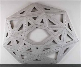 Alphabet A, en acier brossé, se compose de trois éléments aux contours obliques emboîtés les uns dans les autres. Alphabet B, en aluminium, trace une sorte de pentagramme déployé en rosace autour d’un vide central à sept côtés. Les différents triangles imbriqués dans cette configuration globale semblent délimiter des trapézoïdes, des étoiles ou des hexagones selon la façon dont on les regarde.
