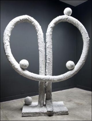 Plus en détail, certains éléments composant les sculptures viennent perturber le regard: ici une vieille chaussure sert de pied bot à l’une des courbes du nÅ“ud, là sur le socle une chaussette est étendue, tandis que de petits volumes ronds, de la taille d’un ballon, sont fixés à divers endroits.