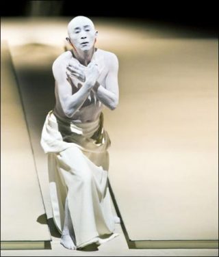 Il y a, c’est sûr, de l’universel dans le butō d’Ushio Amagatsu –toutes les citations précédentes le suggèrent, qui viennent de François Delsarte et de ses disciples, des fondements des arts de la scène en Occident, modernité puisant, elle aussi, aux mémoires d’avant l’histoire. Quelque chose d’universel qui, dans Umusuna, s’inscrit par contraste dans la chair de l’histoire d’un peuple. Des ombres restèrent parfois sur des débris de murs, mémoires de corps pulvérisés en un grain de seconde par le feu nucléaire d’Hiroshma et de Nagasaki. Des fulgurances lumineuses restent dans le regard à la fin d’Umasuna. Car Ushio Amagatsu tient son propos jusqu’au bout, jusqu’aux saluts absolument chorégraphiés. Et quand, à force de rappels, revient avec insistance la même image de corps blancs tranchants sur la noirceur qui descend sur la scène, c’est l’image de la Transfiguration qui s’impose – corps qui rayonnent.
