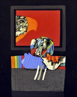 Le langage plastique que s’est forgé le peintre atteint aujourd’hui une réelle densité plastique. Une qualité dans le rassemblement des formes qu’il nous donne à voir et une nouvelle et intense magnificence de la couleur. Petit à petit disparaît l’écriture ou la lettre. Sans cesse, il trouve des combinaisons nouvelles et heureuses pour l’agencement des formes, nous faisant part ainsi de son émotion. De ce chatoiement de couleurs se dégage comme un chant vibrant, comme la voix rauque, ardente du bédouin dans le désert. Car regarder sa peinture c’est entendre — sa couleur est sonore, ses formes musique — sa peinture est voix. Voix humaine, belle. Voix authentique qui raconte la pure et dure existence des bédouins, des nomades, des paysans en Irak, leur piété, leurs superstitions, leurs aspirations profondes. La peinture de Dia Al-Azzawi évoque aussi le tapis d’Orient. Chefs-d’œuvre de patience chargés de symboles et de significations. Langage secret et raffiné empli d’une poésie profonde, racontant depuis des siècles l’histoire et les émotions d’obscures tribus. Aussi, pour celui ou celle qui regarde les toiles du peintre, la rutilance et la beauté de ses couleurs n’invitent pas seulement à la délectation des yeux. Derrière cette architecture de formes et de couleurs aux résonances rythmiques et musicales, se cache l’homme qui parle de son pays — qui le chante plutôt. Nos yeux doivent écouter.»