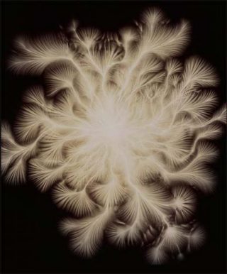 Mécanique et chimique, elle est exploitée comme un champ d’expérimentation, non pas tant pour reproduire le visible, que pour rendre visible ce qui échappe à la perception physique. Sous les volutes de l’éther au néon tremblé de Claude Lévêque, se succèdent des œuvres d’Étienne Léopold Trouvelot, mi scientifique mi artiste de la fin du XIXe siècle, qui reproduisait en pastel léché ses observations astronomiques, mais captait aussi photographiquement les motifs surprenants, et invisibles, d’étincelles électriques, qu’André Breton, dans le Minotaure n°5 de 1934, associera aux fulgurances de l’écriture automatique, des études aérodynamiques de Marey, des photogrammes de Man Ray, Moholy Nagy et Aneliese Hager, La Nébuleuse, de Raoul Ubac, un agrandissement photographique vain d’une pierre chamanique, par Joachim Koerster, qui ne révèle rien de son pouvoir, etc.