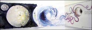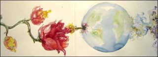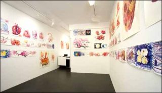 Sur les murs de la galerie Nathalie Obadia, les dessins se suivent, s’assemblent en frise. Dominant, le motif floral se décline en une série de portraits hybrides, s’accouple avec des fragments d’anatomies humaines, animales ou même paysagères : cerveau discrètement sanguinolent, abdomen d’insecte tronqué, vague s’enroulant sur elle-même, planète. Certains croquis sont liés entre eux par une sorte de cordon ombilical, offrant comme une nouvelle version de la chaîne de l’évolution, anachronique et fantasmée, fusion des réalités cosmiques et terrestres, confusions des espèces et des règnes.