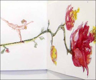Tel un memento mori, la belle technique, l’aquarelle douce et diluée d’Anne Ferrer s’en prend ironiquement aux plaisirs terrestres, aux vanités humaines, révèle le corps dans sa mortalité, l’érotisme dans sa morbidité. La couleur perd de sa portée décorative, de sa naïveté. Partout le rose des chairs, de l’intérieur du corps, le rose de l’obscène. Le rouge du sang. L’orangé et le vert des moisissures. «Ici l’automne vient, fane les roses […] Il faut mourir, madame !», profère, en écho au pinceau cynique, la plume élégante de Marie Darrieusecq.