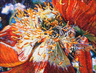 Les peintures de Christophe Giral donnent l’impression d’un arc-en ciel, quoi qu’elles représentent. Au rouge vif du coquelicot se mêlent des touches de bleus, de jaune ou de vert. Les feuilles éparses de l’automne japonais apparaissent roses, bleues ou vertes, voire les trois à la fois. Même les branches d’arbres enneigées se colorent dans ses œuvres. Est-ce un hommage à la multitude de couleurs contenues dans la lumière ou bien à la flamboyance de la réalité qu’elle illumine ?