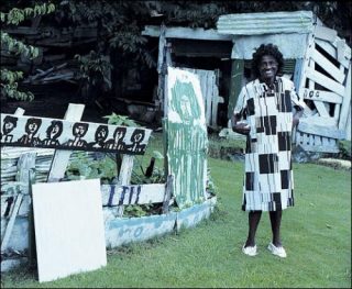 Si, à cause de sa surdité, elle s’était dès sa jeunesse réfugiée dans une pratique acharnée du dessin à même le sol, à l’âge de 80 ans elle improvisa une forme de patchwork visuel à l’échelle de son jardin et de sa propre maison.