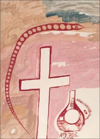Carlo Zinelli commençait tout juste à peindre sur papier ce qu’il avait ébauché plus tôt en lacérant les murs de l’établissement avec des pierres et des morceaux de brique. Né en 1916, il a commencé par travailler à la ferme puis aux abattoirs. Volontiers solitaire, il se distinguait alors par son dandysme, son goût pour le dessin et la musique, avant que la guerre, qu’il fit comme chasseur alpin, n’exacerba sa schizophrénie. Son oeuvre — sorte de conte autobiographique qui mêle ces épisodes ayant précédé l’internement — représente une véritable révolution formelle: tour à tour l’itération, la dislocation, le dédoublement, l’atrophie, la stylisation, l’absence de perspective, les variations de plan et d’échelle, l’écriture dans les interstices qui bat comme un pouls, et puis la couleur, la couleur donnant aux silhouettes une densité palpable, tout ceci confère à la composition un rythme d’une modernité effrénée.