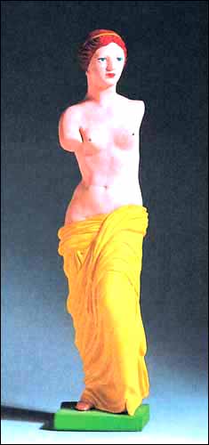 Dans le hall d’entrée de l’hôtel de la rue Berryer, un David en plâtre, repeint aux couleurs crues et sans nuance de la BD populaire, donne le ton pop et iconoclaste de l’exposition. Suit le bric-à -brac surréaliste de la première salle : en son milieu, deux vitrines présentent une collection hétéroclite de petits objets du quotidien (canif, clefs, sifflet, interrupteur électrique, etc.) soigneusement alignés et numérotés ; contre un mur, deux grands cadres retiennent des mosaïques feuilletées d’images découpées dans les magazines : photos d’actualité, paysages, portraits, célébrités ou vedettes d’un jour, en noir et blanc, ou en couleurs ; sur une bande de mur, peinte en jaune vif, des cartes postales épinglées : elles reproduisent les œuvres les plus célèbres des maîtres de la peinture classique (Rembrandt, Raphaël, Botticelli, Michel Ange, Brueghel, etc.) ; et, encore, un vélo, un atlas ouvert à la page du sous-continent sud-américain ; une caméra 16 mm, prête à filmer les déambulations du visiteur, qu’un « Thank You » en noir sur blanc, remercie de sa visite (souvenir d’une exposition new yorkaise), etc.