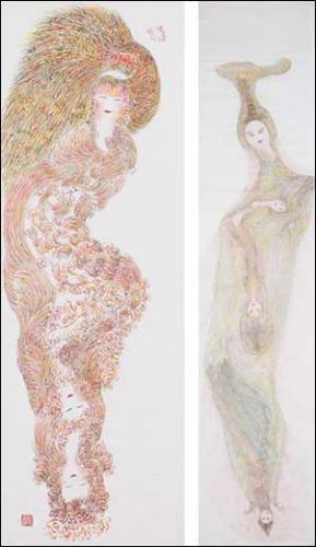 Ces dessins figurent tous de grands personnages — divinités, empereurs et autres figures légendaires — pour la plupart présentés en double, tête bêche, comme sur des cartes de tarot. Ni bras ni jambes: la partie inférieure du corps disparaît comme une queue de sirène. L’important, c’est la tête, l’esprit… Des lettres, des signes apparaissent parfois autour des figures, ce qui ajoute à l’idée d’une signification cachée et d’une fonction secrète de ces dessins. Guo Fengyi dessine, pour la visualiser, l’énergie vitale des corps. Elle travaille à partir d’un creuset de connaissances hétéroclites: la mythologie, l’astrologie, la géomancie, la médecine traditionnelle chinoise…