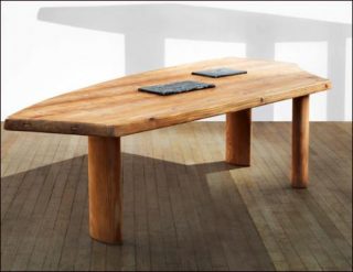 L’usage du bois répond sans doute aux contraintes des temps de guerre, mais son épais plateau de madriers de sapin assemblés de languettes de chêne s’inscrit profondément dans l’esthétique de Pierre Jeanneret, qui aimait « les belles épaisseurs de plateau ».