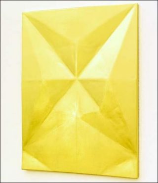 Sont également exposés une série de travaux nouveaux réalisés sur des panneaux de bois d’érable. Chaque panneau se décompose en plusieurs pièces de boiserie façonnées individuellement puis assemblées et recouvertes de feuilles d’or, reprenant en trois dimensions la surface créée par les plis des dessins. La légèreté et subordination du papier plié est ainsi mise à l’épreuve dans un travail artisanal complexe. Avions en papier devenus icones païennes vidées de leur contenu, les panneaux réfléchissent la lumière sur une surface protéiforme.