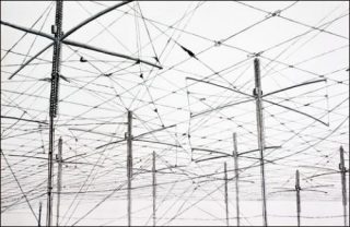 A l’objet contenant qui n’autorise pas son appréhension globale, répondent des dessins comme des gros plans, des points d’entrées. La plupart des aquarelles présentées sont inspirées de photographies prises par l’artiste ou d’images trouvées dans les médias. Ainsi, des paysages ruraux vus du ciel, des gros plans de ruches d’abeilles, des bâtiments contemporains, des pipelines, ou encore des structures qui témoignent de l’évolution technologique. Autant de lignes, de grilles qui révèlent des systèmes d’organisations et de communications de l’ensemble des êtres et des choses qui composent notre planète. Une sorte d’inventaire impossible qui questionne la position de chacun dans un vaste ensemble insaisissable. Le projet s’avère être d’une actualité poignante. Le monde contemporain globalisé, où l’économie comme l’information sont régis au niveau mondial, dépersonnalise le système qui semble devenir une entité fictionnelle, incontrôlable, inatteignable. Chez Sigismond de Vajay, — qu’il s’agisse de la quantité des figures composant certains dessins ou qu’il s’agisse du rapport sériel avec lequel l’artiste aborde sa production —, le nombre est corollaire d’une machinerie abstraite et monstrueuse.