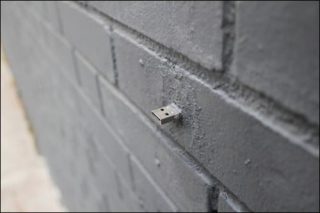 Figure de proue de la nouvelle génération du net art, Aram Bartholl a pris l’habitude d’immiscer des éléments du net dans notre quotidien. Connu pour ses icônes Googles Map monumentales, l’artiste propose ici un réseau P2P primitif. Dans le mur extérieur de la galerie, Aram Bartholl cimente une clé USB laissée à l’usage de tous. Chacun peut y déposer ou y prélever des fichiers, même en dehors des horaires habituels d’ouverture du lieu. Volontairement low tech, cette œuvre ré-initie la valeur matérielle du troc, voire la pratique ancestrale des offrandes précieuses faites aux pieds des totems.
