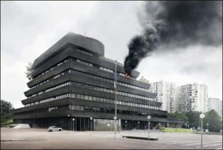 Vincent Debanne, présente deux séries photographiques qui toutes deux questionnent la représentation archétypale de la ville et le rapport de l’homme à son environnement. Avec «Incidents», Vincent Debanne détourne les symboles du pouvoir et de l’autorité que représentent les hôtels de ville, préfectures, tribunaux… produits de l’urbanisme des années 60-70 des Villes Nouvelles. Ces bâtiments, exhibant clairement leurs fonctions de gouvernance sont ici mis à mal par la fumée et le feu. Les acteurs en sont absents, les émeutiers restent invisibles, les forces de l’ordre ont déserté, la population se cache… Dans «Station», il photographie des voyageurs arrêtés dans leur trajet quotidien, en quête de direction. À ces portraits, il associe des paysages suburbains: préfabriqués aux allures de carton-pâte, architectures de béton, souvent surmontés de cieux annonciateurs d’une catastrophe imminente. Regards de stupeur ou d’incrédulité, bouches bée, gestes crispés sont autant d’attitudes qu’arborent les personnages et qui font basculer l’image vers une aventure commune.