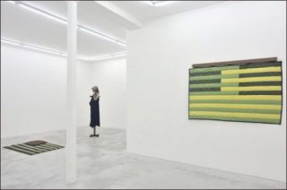Un patchwork matelassé en vert, jaune et noir fixé au mur propose une analogie entre le drapeau rayé et la topographie d’un champ agricole. Au sol, la structure du drapeau est ensuite reprise en deux versions, l’une en gamme marron et l’autre en gamme verte, au moyen de boudins en toile et d’un coussin.