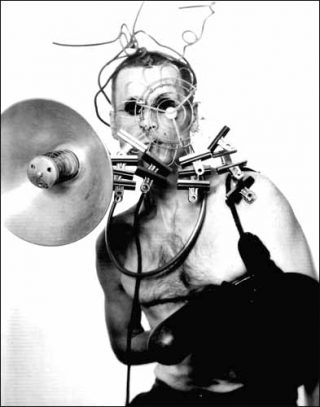 — Photoperformance, 1990. Photo noir et blanc, cadre doré.