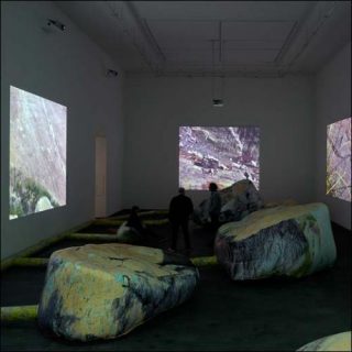 Là , la photo argentique cède le pas à des impressions numériques sur des structures gonflables, qui ne sont pas sans rappeler les parcs d’animation pour enfants. On est invité à s’allonger, à se prélasser sur les faux rochers. Et à se laisser hypnotiser par les vidéos super 8 qui recouvrent les murs sombres de la salle d’exposition. Les herbes et les épis volent au vent, frémissent, et offrent au spectateur une expérience immersive.