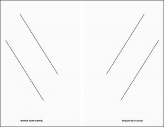 Nos systèmes de représentation sont également bousculés par le diptyque Mirror With Vampire, Window With Ghost composé de deux dessins parfaitement symétriques représentant chacun deux traits obliques sur une surface en verre. Ce diptyque repose sur deux principes: 1° un fantôme est transparent, donc invisible derrière une fenêtre elle-même transparente; 2°un vampire ne se reflète pas dans un miroir. Ces deux dessins montrent bien ce qu’il y aurait à voir dans une telle scène: l’absence d’image. Pourtant, notre attente suscitée par le titre de l’œuvre est déçue. Nous sommes directement renvoyés à nos mécanismes de représentation, beaucoup moins logiques que nous le prétendons. (Texte rédigé à partir du communiqué de presse de l’exposition écrit par Klaus Speidel).