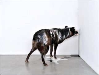 — Douglas Gordon, Untitled, 2014. Black wolf, acrylic paint, oil paint, mounted on wood. 187 x 64 x 106 cm