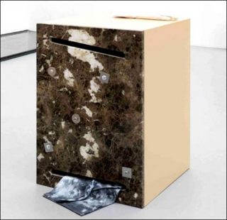 Une fois cette «porte» franchie, nous pénétrons dans un lieu froid, déserté par l’homme : un espace en jachère ou en devenir, dont les actants auraient quitté les lieux abruptement. C’est ce que suggèrent les deux moulages de gants de travail abandonnés sur des présentoirs en marbre.