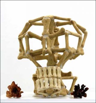 Par un glissement à l’intérieur du champ sémantique du chien, l’exposition se poursuit par des squelettes montés en croquettes. Quelques rondelles de bacon se glissent entre leurs articulations.