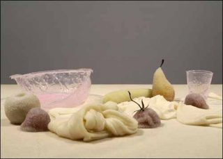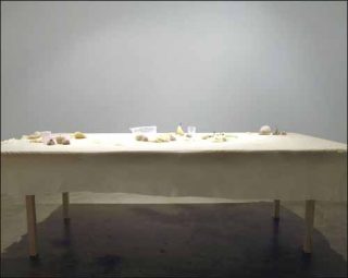 La sensation mêlée que suscitent ces travaux est plus exacerbée encore dans la seconde salle de l’exposition. Une table y est dressée, présentant des fruits et des légumes posés ça et là avec cette négligence apparente propre aux natures mortes. Aperçue dans l’encadrement de la porte, la table attire comme on serait alléché par un festin. Là aussi, une odeur est perceptible, un peu douçâtre, à la fois agréable et vaguement écœurante.