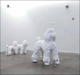 Ces caniches apparemment tout juste sortis d’une séance de soins esthétiques sont l’image kitch de la beauté de magazine : impeccable mais artificielle. Promis à une décrépitude accélérée (il faut réajuster leur brushing de mousse toutes les trois semaines), ces chiens prennent place dans une vaste vanité qui occupe toute la galerie.