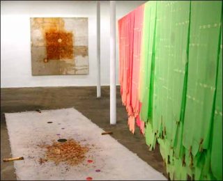 Les papiers colorés et décolorés sont présents dans presque toutes les œuvres. Une installation juxtapose sur une table des papiers roulés, décolorés par la lumière sur les bords et sur la partie externe des rouleaux.