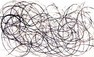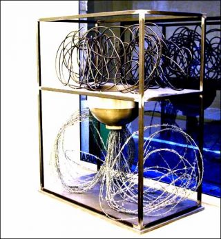 Si nous n’y prenions garde, Sans titre (fer et acier, 2002) pourrait se résumer à une table métallique percée d’un entonnoir traversé par des câbles dans la partie supérieure et des barbelés dans la partie inférieure. La sculpture fait figure de machine à produire des barbelés, à transformer une matière lisse en matière rugueuse, symbole d’oppression. Alternativement doux et agressifs, ces entrelacs métalliques renvoient aux méandres du cerveau humain, aux multiples personnalités qui nous habitent, aux tréfonds de notre conscience.