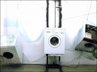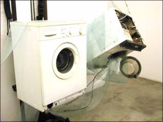 L’oppression apparaît comme un leitmotiv des œuvres récentes de Tsekura. Les Filles du Rhin, sculpture mécanique composée d’une machine à laver ballottée de haut en bas, fascine par la violence visuelle et le bruit mécanique qu’elle produit. Le dispositif est fou, mais d’une folie réglée et chorégraphiée.