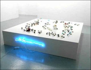 — The swimmer, 2005. Ampoules, pens of varnish to water, néon, lumière, bois. 200 x 200 x 40 cm.