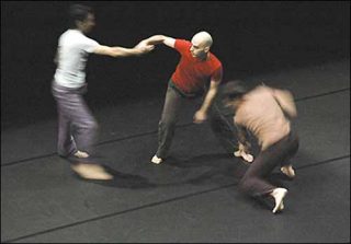 Dès les premiers pas de Equally Loud, extrait de Surface, série de trois soli pour quatre femmes dont la violoniste Hae Sun Kang, nous sommes sous le charme d’une juste proportion entre la virtuosité du mouvement et sa nuance un brin ludique. Il y va d’une danse abstraite, légère et complexe à la fois. Le texte, qui en constitue la bande son, se dresse en pure matière sonore, dépourvue de tout élément narratif. La juxtaposition de la danse et du texte lu nous place dans un présent de la perception visuelle et sonore, que l’apparition insolite d’une femme aux apparences de pin-up vient déchirer, de manière ludiquement inquiétante.