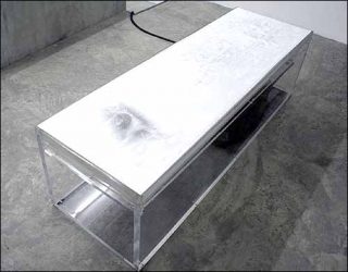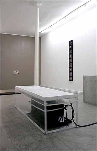 — All In One Day, 2007. Eau, moteur, système de réfrigération, plexi, acier. 180 x 60 x 55 cm.