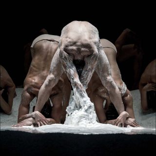 Les corps nus évoluent dans un décor sombre, où l’eau se fait successivement éclaboussante, moussante et givrante. Sur scène, la sculpture de Kohei Nawa se présente comme un navire de glace blanche, faite à partir d’un matériau très particulier : le katakuriko, issu de la fécule de pomme de terre, qui se solidifie lorsqu’on la manipule et se liquéfie lorsqu’on cesse de la toucher. La sculpture reflète ainsi la dualité présente dans le corps humain, corps solide composé à plus de moitié d’eau.