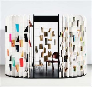 Area définit un nouveau concept de meuble bibliothèque en délimitant un espace semi-fermé à l’intérieur d’une pièce. Ce dispositif crée une enveloppe autour de soi, elle tient le corps tout en ménageant des transparences entre dedans et dehors. Constituée de modules verticaux, Wall est une cloison auto-portante à plusieurs pans qui fragmente un espace en plusieurs sous-espaces. Block répond en un seul module aux fonctionnalités d’une chambre et d’un bureau, en intégrant un étage avec un escalier donnant accès à un lit.