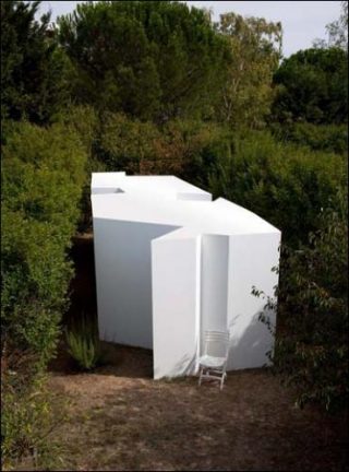 À la manière des sentiers de montagne balisés dont elle porte le nom, «Via Ferrata» présente une main-courante qui serpente le long de la structure composite, invitant le spectateur à arpenter ces volumes, figurant comme des rochers stylisés. L’idée de la trajectoire est récurrente chez l’artiste. «J’ai toujours été attiré par le mouvement, notamment lorsque l’on est transporté. Que ce soit lors d’un voyage en avion, en train, en voiture, mais aussi simplement en vélo, dans un ascenseur, un couloir…», explique-t-il. Ici, chacun peut vagabonder à sa guise, autour ou à travers ce morceau de paysage, libre d’entreprendre un cheminement par lequel le choix se fera de gravir ou de contourner les obstacles.